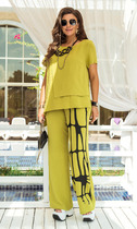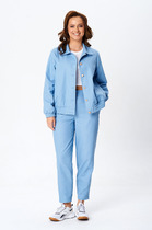 Длина жакета по спинке около 66 см в размерах 40-46 и около 69 см в размерах 48-52, длина рукавов около 61 см. Длина брюк по боковому шву с поясом около 97 в размерах 40-46 и около 98,5 см в размерах 48-52, длина по внутреннему шву около 70 см.