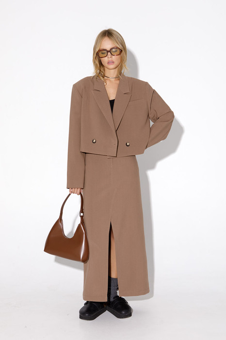Костюм-двойка из укороченного оверсайз жакета с расширенными плечами и миди-юбки с разрезом. Детали: прямой силуэт, спущенная линия плеча, пиджачный воротник, перед с функциональным нагрудным карманом, застежка двубортная на петли и пуговицы, рукава втачные двухшовные, жакет на подкладке. Юбка асимметричного кроя с высоким разрезом по переду, притачной пояс со шлевками, застежка на молнию и пуговицу, боковые карманы.
