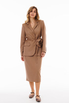 Детали: жакет прилегающего силуэта, талиевые вытачки, отрезные бочки, застежка на петли и пуговицы, пиджачный воротник, функциональные карманы, жакет на подкладке. Брюки с высокой посадкой на притачном поясе со шлевками, передние половины с небольшими застроченными мягкими складками и заутюженными стрелками, застежка на молнию и пуговицу, боковые карманы. Задние части брюк с вытачками и имитацией карманов.