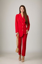 Длина жакета по спинке около 69 см в размерах 40-46 и около 72 см в размерах 48-52, длина рукавов около 62 см. Длина брюк по боковому шву с поясом около 114 в размерах 40-46 и около 115,5 см в размерах 48-52. Длина по внутреннему шву около 83 см