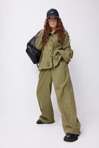 Текстильный костюм-двойка из оверсайз жакета с разрезами по рукавам и укороченных брюк со стрелками.