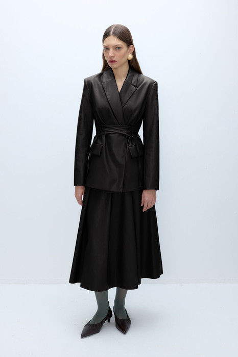Костюм-двойка из жакета со шнуровкой по талии и миди-юбки из экокожи.
