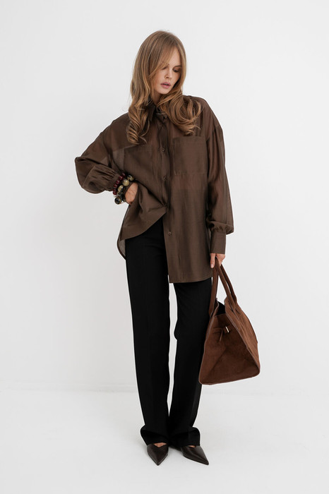 Текстильный комплект-двойка из полупрозрачной оверсайз рубашки и прямых широких брюк со стрелками.
