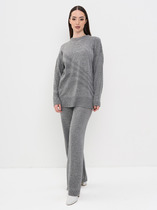 Детали: жакет прямого силуэта, расширенная линия плеч, талиевые вытачки, круглая горловина, без воротника, рукава втачные со шлицами, имитация карманов, застежка на петли и декоративные пуговицы, на подкладке. Широкие брюки-палаццо с небольшими складками у пояса и заутюженными стрелками, притачной пояс со шлевками, застежка на молнию и пуговицу, боковые карманы. Задние части брюк с вытачками и имитацией карманов.