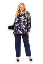 Детали: поло прямого силуэта, свободный покрой, спущенная линия плеча, потайная застежка на петли и пуговицы, длинные рукава. Широкие брюки-палаццо с небольшими складками у пояса и заутюженными стрелками, притачной пояс со шлевками, застежка на молнию и пуговицу, боковые карманы. Задние части брюк с вытачками и имитацией карманов.