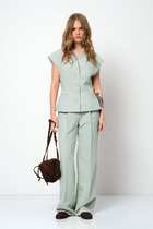 Костюм-двойка из оверсайз жакета с расширенной линией плеч и прямых широких брюк со стрелками.