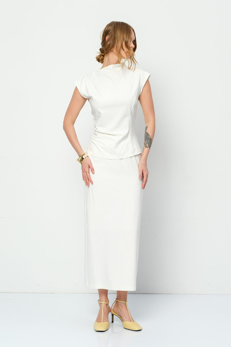 Трикотажный костюм-двойка из облегающей асимметричной блузы и миди-юбки.