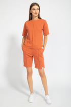 Текстильный костюм-двойка из приталенного жакета со съемным поясом и укороченных брюк со стрелками. Детали: пиджачный воротник, нагрудные вытачки, прорезные карманы с фигурными клапанами, рукава втачные со шлицей, жакет на подкладке; брюки со средней посадкой на притачном поясе, на передних половинах складки и заутюженные стрелки, застежка на молнию и пуговицу, боковые карманы.