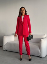 Длина жакета по спинке около 68,5 в размерах 40-46 и около 71,5 см в размерах 48-52, длина рукавов около 63 см. Длина брюк по боковому шву с поясом около 114 см в размерах 40-46 и около 115,5 см в размерах 48-52. Длина по внутреннему шву около 83 см
