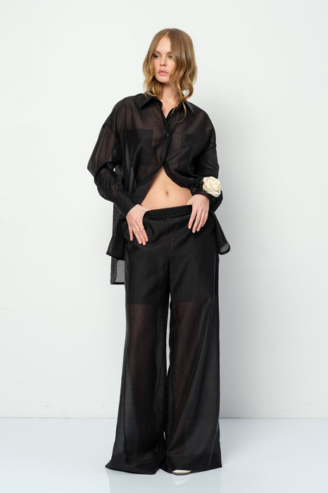 Полупрозрачный костюм-двойка из свободной рубашки и широких брюк на резинке.