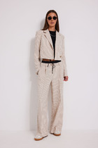 Полупрозрачный костюм-двойка из свободной рубашки и широких брюк на резинке.