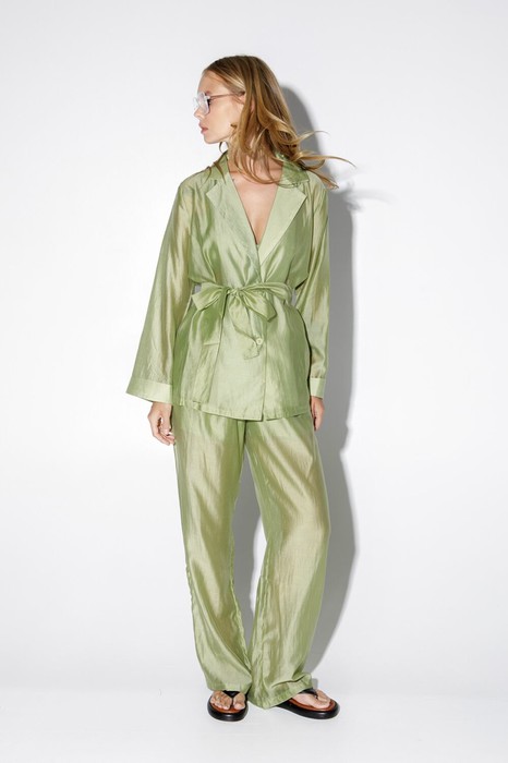 Костюм-двойка в пижамном стиле из свободной блузы и брюк из полупрозрачной вискозы.