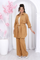 Детали: полуприлегающий силуэт, вырез переда- «качели», топ на подкладке, при помощи поясов можно регулировать прилегание. Также пояса можно завязать спереди. Брюки с притачным поясом со шлевками, складки у пояса, застежка на молнию и пуговицу, боковые карманы. Задние части брюк с вытачками и имитацией карманов.