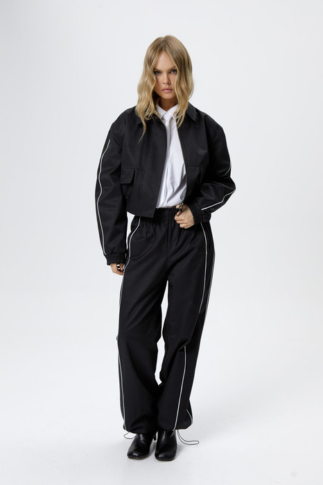 Спортивный костюм-двойка из куртки-бомбера и брюк с кантами.