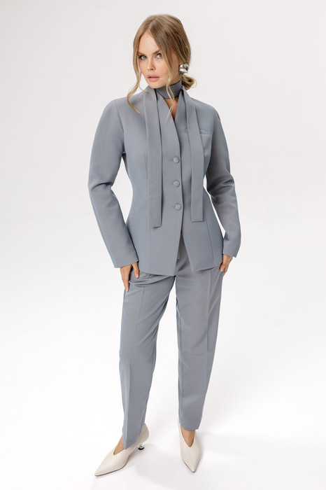 Костюм-двойка из приталенного жакета с акцентными плечами и укороченных классических брюк со стрелками.