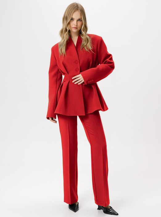Костюм-двойка из приталенного жакета со складками и брюк-клеш со стрелками.