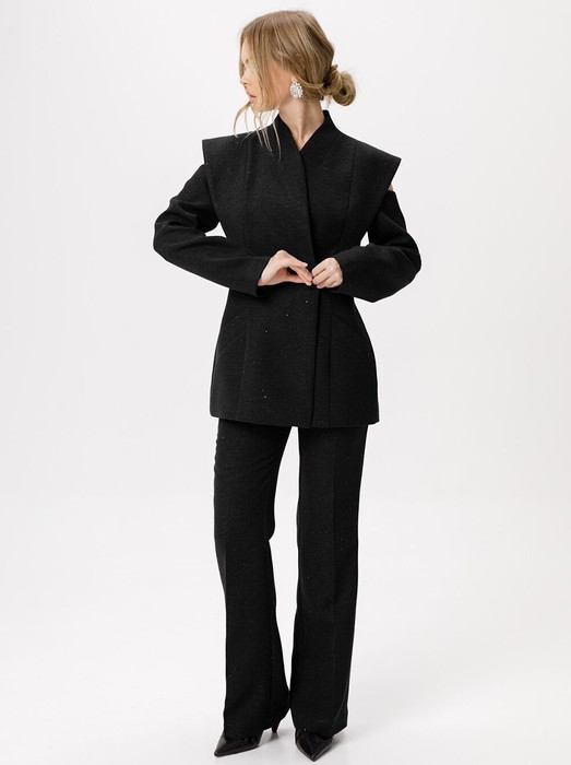 Костюм-двойка из приталенного двубортного жакета и облегающих брюк-клёш со стрелками.