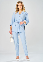 Детали: жилет прилегающего силуэта, талиевые вытачки и рельефы по переду, спинка со средним швом и талиевыми вытачками, функциональные карманы с листочками, центральная застёжка на 5 пуговиц, жилет на подкладке. Брюки с притачным поясом со шлевками, складки, застежка на молнию и пуговицу, боковые карманы. Задние части брюк с вытачками и имитацией карманов.