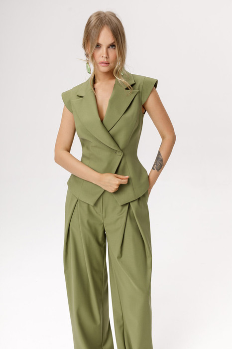 Костюм-двойка из приталенного асимметричного жилета на одно плечо и прямых широких брюк из текстильной ткани.