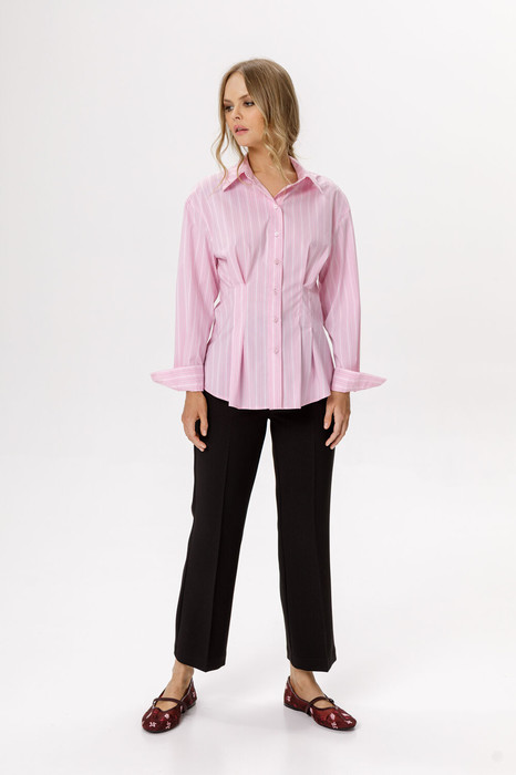 Комплект-двойка из приталенной рубашки в полоску из хлопка и укороченных брюк клёш со стрелками.