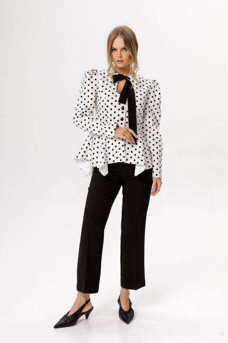 Комплект-двойка из хлопкового жакета в горохи с вырезом-каплей и укороченных брюк клёш со стрелками.
