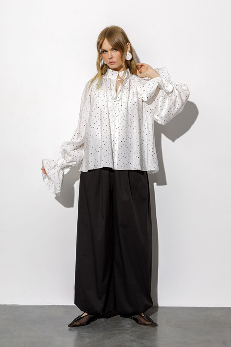 Комплект-двойка из свободной блузы в горохи и широких свободных брюк-алладинов.