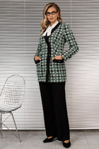 Жакет современного прямого силуэта однобортный, застёгивающийся на петли и пуговицы, край борта скругленный по низу изделия. Воротник пиджачного типа с отложными лацканами. По переду обработаны прорезные карманы в рамку с клапанами. Рукава втачные двухшовные. Спинка со средним швом. Изделие на подкладке.