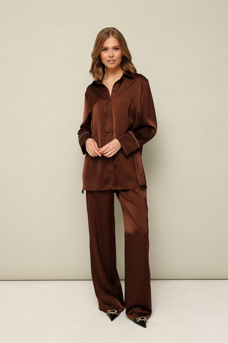 Женский комплект, состоящий из рубашки и брюк, выполнен из струящейся ткани с благородным матовым блеском. Рубашка современного прямого силуэта с центральной застежкой на петли и пуговицы. Горловина с рубашечным воротником на притачной стойке. Рукава со спущенной линией втачивания плеча с притачной манжетой. Брюки прямого силуэта с боковыми наклонными карманами. Пояс притачной на резинке, для регуляции размера. По манжете рубашки и в боковом шве брюк обработан кант. В комплекте прилагается акцентный ремень