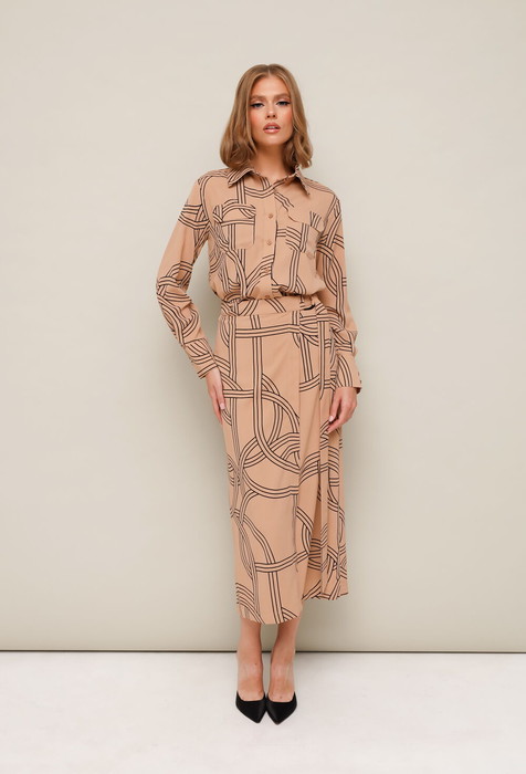 Комплект 2-предметный, состоящий из блузки и юбки на запах. Блузка прямого кроя, горловина обработана воротником на стойке, застежка на притачной планке на петли и пуговицы. Перед блузки с накладными карманами с клапанами. Рукава длинные с притачной манжетой с застежкой на пуговицы. В боковых швах обработаны разрезы. Юбка на запах в длине миди. Притачной пояс с застежкой на полукольца, внутри фиксируется на пришивные кнопки.