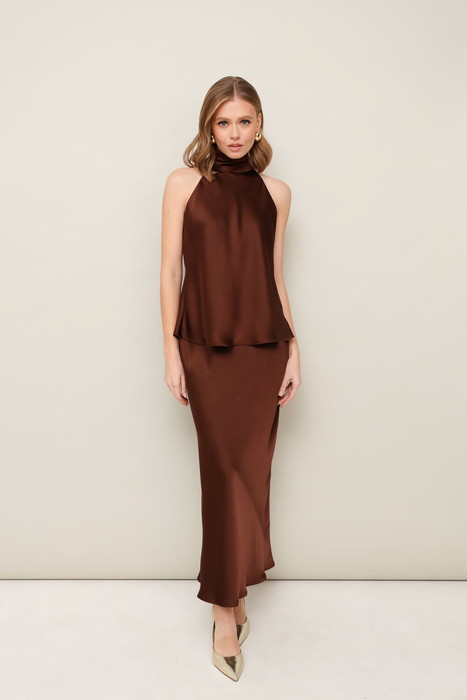 Юбка с кроем «по косой» в длине миди, пояс на обтачке, застежка в боковом шве на потайную тесьму молнию.