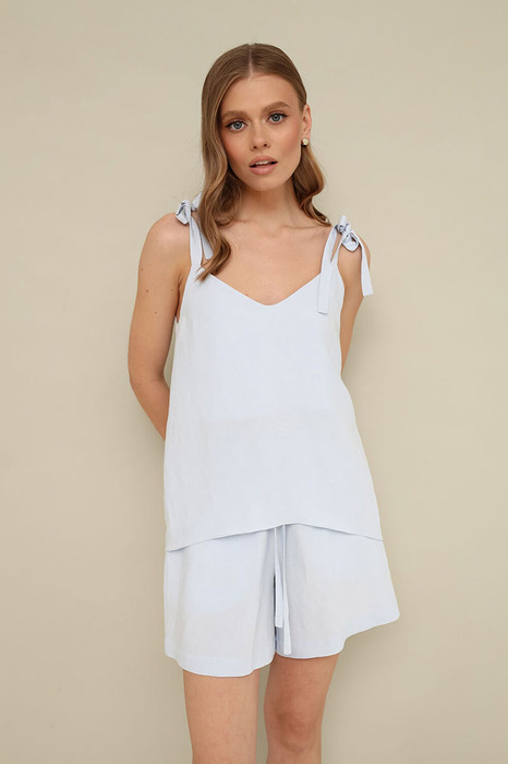 Стильный 2-х предметный комплект, состоящий из топа и шорт, выполнен из натуральной ткани.
