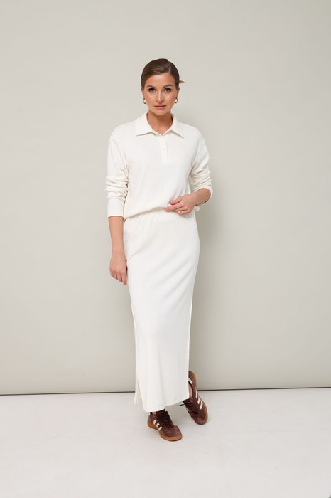 Комфортный трикотажный комплект, состоящий из поло и юбки. Поло с отложным воротником с цельнокроеной стойкой. Вырез горловины обработан притачными планками с застежкой на петли и пуговицы. Спущенная линия втачивания рукава. Юбка прямого кроя, пояс на резинке, в боковых швах обработаны высокие разрезы.