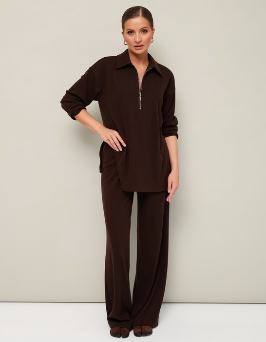 Комфортный брючный комплект с джемпером, выполнен из качественного трикотажного полотна. Джемпер прямого силуэта. Горловина с отложным воротником с застежкой на молнию. Длинные рукава со спущенной линией втачивания плеча. В боковых швах обработаны высокие разрезы. Брюки прямого кроя с посадкой на талии. Пояс обработан эластичной резинкой.
