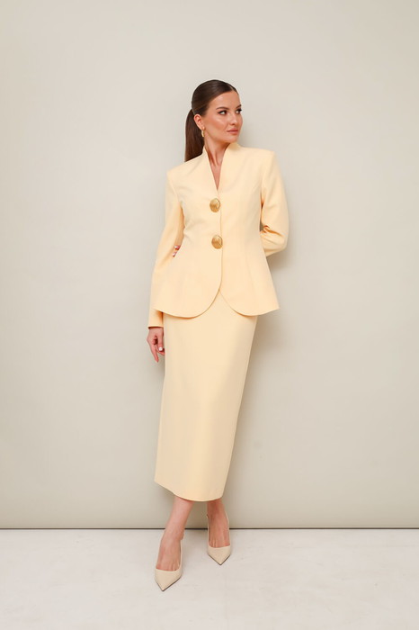 Жакет прилегающего силуэта, слегка расширенный к низу. Горловина с цельнокроеной стойкой и V-образным вырезом. Центральная застёжка на потайные пришивные кнопки с декоративными акцентными пуговицами. Рукава втачные, двухшовные. Спинка с рельефами и средним швом.