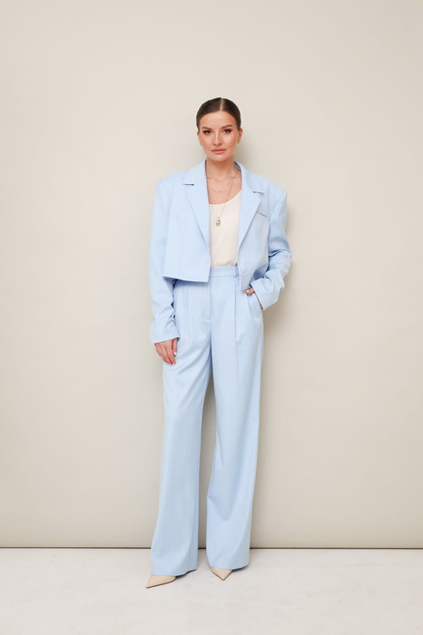 Укороченный жакет актуального прямого силуэта с удлиненным плечевым швом. Центральная застёжка на петлю и пуговицу. Воротник пиджачного типа с отложными лацканами. Спереди обработан нагрудный прорезной карман в рамку. Рукава втачные двухшовные с легкой сборкой в нижней части. Спинка со средним швом. Жакет на подкладке.