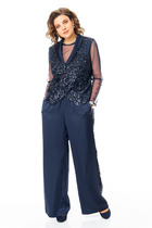 Костюм молодежный из трикотажного полотна «кулирка» в комбинации двух видов: с набивным рисунком и гладкокрашеного в единой цветовой гамме, состоящий из футболки и брюк. Футболка - из гладкокрашеного полотна, классического покроя, с короткими втачными рукавами, горловиной овальной формы и принтом на полочке, выполненным в технике «шелкографии». Горловина обработана притачной бейкой из основного материала.Брюки - из полотна с набивным рисунком, длинные, слегка расширенные книзу, с карманами в боковых швах, на притачном поясе с эластичной тесьмой внутри.