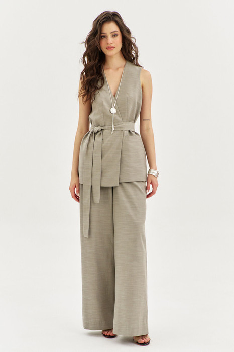 Комплект, состоящий из жилетки и брюк. Жилетка свободного кроя, длиной чуть ниже линии бедер. Спинка со средним швом, в котором обработана шлица. Перед с талиевой вытачкой, переходящей в карман. Карман прорезной с листочкой. Вырез V-образный, без воротника. Жилетка без застежки, на подкладке, с плечевыми накладками. Жилетку дополняет съемный пояс. Брюки палаццо, длинные, на притачном поясе с частично вставленной резинкой. По задним половинкам талиевые вытачки. По передним половинкам заложены односторонние складки, обработаны боковые карманы с наклонным входом. Застежка с гульфиком и откоском на тесьму-«молнию». По поясу вставлены шлевки.