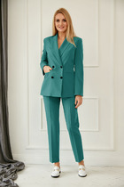 Комплект женский, состоящий из блузки и юбки. Блузка свободного кроя, длиной до бедер. Спинка со средним швом, в котором по горловине обработана застежка на навесную петлю и пуговицу. По переду нагрудные вытачки. Блузка без рукавов, с фигурной проймой. Горловина округлой формы. Юбка прямого силуэта, длиной чуть ниже щиколотки. Заднее полотнище с талиевыми вытачками и средним швом. Переднее полотнище со средним швом, в котором обработан высокий разрез, с боковыми карманами с наклонным входом с клапанами. На клапанах пришиты пуговицы. В среднем шве переда обработана застежка на тесьму-«молнию» с гульфиком и откоском. юбка на притачном поясе с фигурным уступом по переду, с резинкой по спинке. По поясу вставлены шлевки. Пояс с застежкой на петлю и пуговицу. По поясу застежка на петлю и пуговицу.