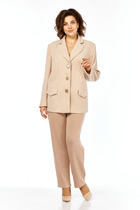 Костюм, состоящий из джемпера и брюк. Джемпер полуприлегающего силуэта, длиной до бедер. Прилегание по талии достигнуто за счет встречных складок. Рукава одношовные, втачные, по низу с притачной манжетой. По горловине вставлен капюшон. По переду застежка на декоративную тесьму-«молнию». По молнии вставлен кант из контрастной ткани. Джемпер без подкладки. Брюки длинные, расширенные к низу, на притачном поясе с резинкой. На передних половинках заложены встречные складки и обработаны карманы с листочкой. В боковые швы вставлен кант из отделочной ткани. Брюки без застежки.