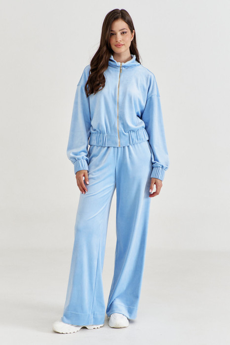 Комплект, состоящий из бомбера и брюк. Бомбер, свободного кроя, длиной чуть ниже талии. По переду застежка на декоративную тесьму-«молнию». По горловине воротник стойка. Линия плеча спущена. Рукава длинные, по низу с притачной манжетой, в которую вставлена резинка. По низу бомбера вставлена резинка. Брюки свободного кроя, длинные, на притачном поясе с резинкой. В боковых обработаны карманы с наклонным входом.