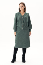 Костюм женский двухпредметный: блузон и брюки. Предназначен для повседневной носки. Блузон полуприлегающего силуэта, диной до линии бедер, с фигурным низом. Перед с одной нагрудной вытачкой, с отрезным рельефом, выходящим из плечевого шва, проходящим через центр груди и до низа, с отрезным бочком. Между центральной частью и рельефом вертикальная обтачная планка. Спинка с двумя талиевыми вытачками, средним швом, левая часть спинки окантована и закреплена на правой. Застежка на одну навесную петлю и одну пришивную пуговицу по горловине спинки. Горловина круглая, обтачная, без воротника. Рукав длиной 7/8. Верхний срез обработан и окантован. Рукав с притачной манжетой. Блузон с плечевыми накладками. Планка переда с тремя пришивными металлическими пластинами. Брюки длинные, слегка заужены к низу, со стрелками. Передние и задние половинки с двумя талиевыми вытачками. Застежка на потайную тесьму-молнию в среднем шве брюк на передних половинках. Верхний срез брюк с притачным поясом с эластичной тесьмой между боковыми швами и вытачками на задних половинок, застегивающийся на одну обметанную петлю и одну пришивную пуговицу. Длина спинки 65 см. Длина рукава 50 см. Длина брюк 103 см