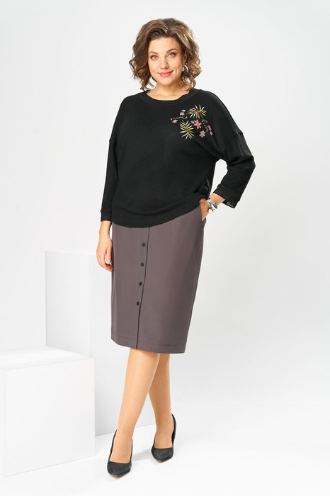 Костюм женский двух предметный: джемпер и юбка предназначен для повседневной носки. Джемпер прямого силуэта, длиной до линии бедер. Перед цельнокроеный, декорирован худ. Вышивкой. Спинка цельнокроеная. Горловина круглая, с втачной фигурной планкой из отделочной ткани. Джемпер со спущенной проймой. Рукав втачной, одно шовный, длиной 7/8. Юбка прямая, длиной ниже колена. Переднее полотнище с двумя боковыми фигурными карманами. Заднее полотнище с двумя таллиевыми вытачками. Застежка спереди на 8 металлических кнопок. Верхний срез с притачным поясом, с 4 надстрочными шлевками, между карманами и вытачками заднего полотнища пояс собран на эластичную тесьму. Юбка на подкладке. Длина джемпера 53см, длина рукава от горловины 58см. Длина юбки 68см