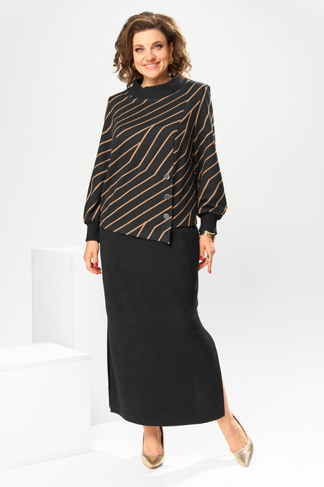 Костюм женский, предназначен для повседневной носки. Костюм женский 2-х предметный джемпер и юбка. Джемпер женский, прямого силуэта, длиной до линии бёдер с фигурным низом. Перед с одной нагрудной вытачкой с отрезным бочком слева, шов соединения бочка с передом заканчивается шлицей, декорированной 3-мя пришивными пуговицами. Спинка цельнокроеная. Горловина круглая с втачной планкой-стойкой из отделочной ткани. Рукав втачной, длинный, одно шовный, низ с лёгкой сборкой и притачной манжетой из отделочной ткани. Джемпер с плечевыми накладками. Юбка женская, слегка заужена к низу, длиной до нижней части икры. Переднее и заднее полотнище цельнокроеные. Боковые швы с разрезами. Юбка с притачным поясом, собранным на эластичную тесьму. Юбка на подкладке. Длина юбки по боковому срезу 87 см. Длина спинки джемпера 60 см. Длина рукава 59 см.