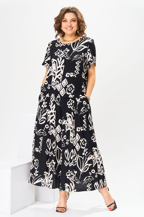 Костюм женский предназначен для повседневной носки. Костюм женский 2-х предметный блузка и юбка-брюки. Блузка женская прямого силуэта, длиной до линии бёдер. Перед с 2-мя нагрудными вытачками. Спинка с отрезной кокеткой, с 1-ной встречной складкой, кокетка декорирована пришивной металлической пластиной. Боковые швы с разрезами. Горловина круглая, обточная, без воротника. Рукав втачной одно шовный, короткий, с приточной отложной манжетой. Блузка без плечевых накладок. Юбка-брюки длинные широкие. Передние половинки с карманами в боковых швах с 2-мя односторонними зафиксированными складками на каждой половинке. Задние без конструктивных особенностей. Пояс притачной, собран на эластичную тесьму, закреплённую 2-мя отделочными строчками. Длина брюк по боковому срезу 90 см. Длина спинки блузона 56 см, длина рукава 22 см.