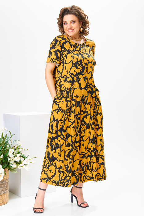 Костюм женский предназначен для повседневной носки. Костюм женский 2-х предметный блузка и юбка-брюки. Блузка женская прямого силуэта, длиной до линии бёдер. Перед с 2-мя нагрудными вытачками. Спинка с отрезной кокеткой, с 1-ной встречной складкой, кокетка декорирована пришивной металлической пластиной. Боковые швы с разрезами. Горловина круглая, обточная, без воротника. Рукав втачной одно шовный, короткий, с приточной отложной манжетой. Блузка без плечевых накладок. Юбка-брюки длинные широкие. Передние половинки с карманами в боковых швах с 2-мя односторонними зафиксированными складками на каждой половинке. Задние без конструктивных особенностей. Пояс притачной, собран на эластичную тесьму, закреплённую 2-мя отделочными строчками. Длина брюк по боковому срезу 90 см. Длина спинки блузона 56 см, длина рукава 22 см.