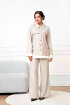 Костюм женский предназначен для повседневной носки. Костюм женский 2-х предметный блузка и юбка-брюки. Блузка женская прямого силуэта, длиной до линии бёдер. Перед с 2-мя нагрудными вытачками. Спинка с отрезной кокеткой, с 1-ной встречной складкой, кокетка декорирована пришивной металлической пластиной. Боковые швы с разрезами. Горловина круглая, обточная, без воротника. Рукав втачной одно шовный, короткий, с приточной отложной манжетой. Блузка без плечевых накладок. Юбка-брюки длинные широкие. Передние половинки с карманами в боковых швах с 2-мя односторонними зафиксированными складками на каждой половинке. Задние без конструктивных особенностей. Пояс притачной, собран на эластичную тесьму, закреплённую 2-мя отделочными строчками. Длина брюк по боковому срезу 90 см. Длина спинки блузона 56 см, длина рукава 22 см.