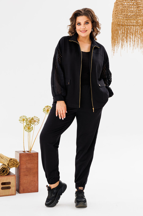 Костюм женский предназначен для повседневной носки. Костюм женский 2-х предметный жакет и брюки. Жакет женский прямого силуэта, длиной ниже линии бёдер. Перед с 2-мя отрезными кокетками, с 2-мя прямоугольными накладными карманами с клапанами, фиксирующимися к карману на металлические кнопки. Спинка цельнокроеная. Горловина круглая с втачной стойкой. Застёжка центральная бортовая на разъёмную тесьму-молнию. Жакет со спущенным плечом. Рукав втачной из отделочной ткани с притачной вертикальной планкой по центру, длинный, низ рукава со сборкой и притачной манжетой. Жакет без плечевых накладок. Брюки женские, длинные, зауженные к низу, с притачными манжетами. Передние половинки с притачными бочками, от линии колена декорированными отделочной тканью, в швах соединения бочков с передними половинками обработаны карманы. Задние половинки без конструктивных особенностей. Брюки с притачным поясом, собранным на эластичную тесьму, закреплённую 2-мя отделочными строчками. Длина спинки жакета 65 см, длина рукава 51 см, ширина плеча 21 см. Длина по боковому срезу 99 см.