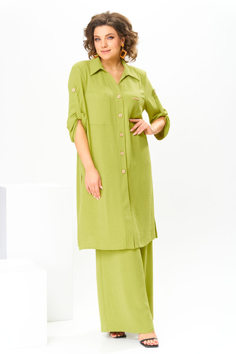 Костюм женский, предназначен для повседневной носки. Костюм женский, 2-х предметный блузка и брюки. Блузка женская, удлинённая прямого силуэта, длиной до середины колена. Перед с 25-мя нагрудными вытачками, выходящими из плечевых швов, с 2-мя накладными прямоугольными карманами на уровне груди, левый декорирован пришивным украшением, с 2-мя притачными вертикальными планками по горловине и краю борта. Спинка с отрезной кокеткой и встречной складкой по центру. Горловина с V-образным фигурным вырезом с втачным воротником рубашечного типа с отрезной стойкой. Застёжка центральная на 5-ть вертикально-обмётанных петель и 5-ть пришивных пуговиц. Боковые швы с высокими разрезами. Рукав втачной одно шовный длиной 7/8 с патой, фиксирующейся на пришивную пуговицу и регулирующей длину рукава. Блузка с плечевыми накладками. Брюки женские прямые широкие длинные. Передние половинки с карманами в боковых швах с отрезными бочками. Задние половинки с таллиевыми вытачками. Брюки с притачным поясом, собранным на эластичную тесьму, закреплённую 2-мя отделочными строчками. Длина брюк по боковому срезу 106 см. Длина спинки туники 100 см, длина рукава 50 см.