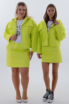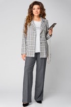 Костюм женский, предназначен для повседневной носки. Костюм женский, 2-х предметный блузка и брюки. Блузка женская, удлинённая прямого силуэта, длиной до середины колена. Перед с 25-мя нагрудными вытачками, выходящими из плечевых швов, с 2-мя накладными прямоугольными карманами на уровне груди, левый декорирован пришивным украшением, с 2-мя притачными вертикальными планками по горловине и краю борта. Спинка с отрезной кокеткой и встречной складкой по центру. Горловина с V-образным фигурным вырезом с втачным воротником рубашечного типа с отрезной стойкой. Застёжка центральная на 5-ть вертикально-обмётанных петель и 5-ть пришивных пуговиц. Боковые швы с высокими разрезами. Рукав втачной одно шовный длиной 7/8 с патой, фиксирующейся на пришивную пуговицу и регулирующей длину рукава. Блузка с плечевыми накладками. Брюки женские прямые широкие длинные. Передние половинки с карманами в боковых швах с отрезными бочками. Задние половинки с таллиевыми вытачками. Брюки с притачным поясом, собранным на эластичную тесьму, закреплённую 2-мя отделочными строчками. Длина брюк по боковому срезу 106 см. Длина спинки туники 100 см, длина рукава 50 см.