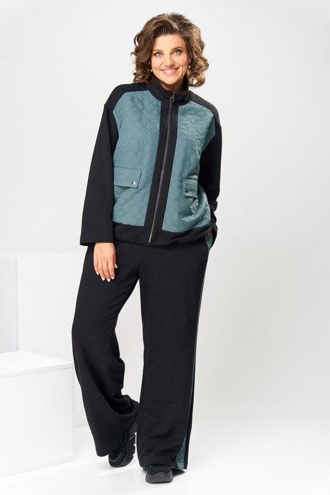 Костюм женский, предназначен для повседневной носки. Костюм женский 2-х предметный жакет и брюки. Жакет женский прямого силуэта, длиной до линии бёдер. Перед с 2-мя отрезными кокетками, с 2-мя нагрудными выточками, с 2-мя притачными вертикальными планками с 2-мя прорезными карманами с клапаном, с закруглёнными концами и обтачной с застёжкой на металлические кнопки. Центральная часть переда, клапан и обточка кармана из отделочной ткани. Спинка со средним швом. Горловина круглая с втачной стойкой из отделочной ткани. Застёжка центральная, бортовая, на разъёмную металлическую молнию. Жакет со спущенным плечом. Рукав втачной длинный одно шовный. Низ жакета с кулисой регулирующийся по ширине 2-мя фиксаторами и резинкой в боковых швах. Жакет без плечевых накладок. Брюки женские прямые длинные. Передние половинки с вертикальными притачными планками из отделочной ткани, с карманами в боковых швах. Задние половинки без конструктивных особенностей. Брюки с притачным поясом, собранным на эластичную тесьму, закреплённую 2-мя отделочными строчками.